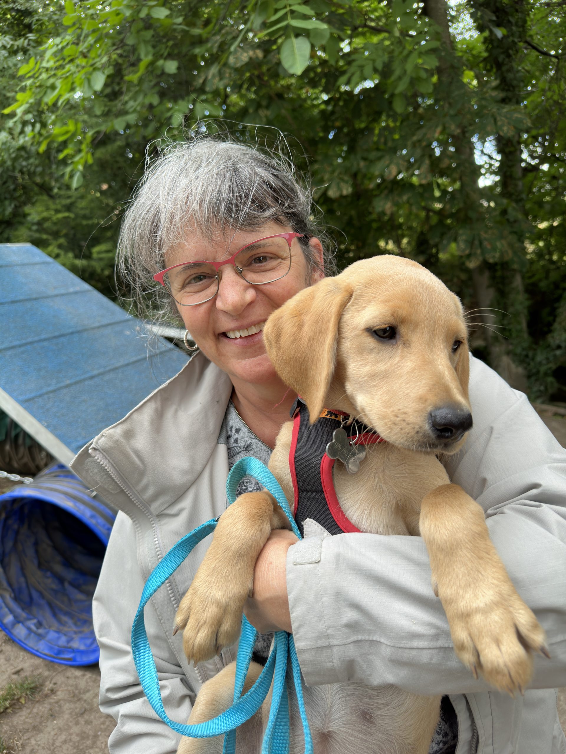 J’ai entendu parler du projet par un article dans un journal. Nous avions déjà deux chiens, des Huskys que nous avions formés, entres autres, avec M. Joshua Zingg. M. Zingg est également formateur à la Fondation Arthanis et nous avait également parlé du projet. A la perte d’un de nos chiens, sa sœur s’est sentie très seule. Nous avons réfléchi au fait de prendre un nouveau compagnon, et l’idée d’accueillir un chiot pour la Fondation Arthanis avait germé dans mon esprit. Avec mon mari, nous avons décidé de franchir le pas après quelques mois de réflexion.