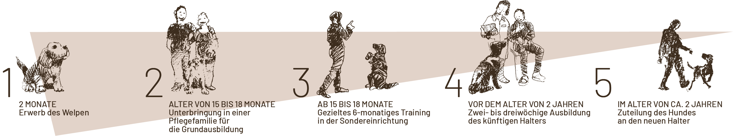 - Unterbringung in einer Pflegefamilie zur Sozialisierung und Grundausbildung (15 bis 18 Monate)